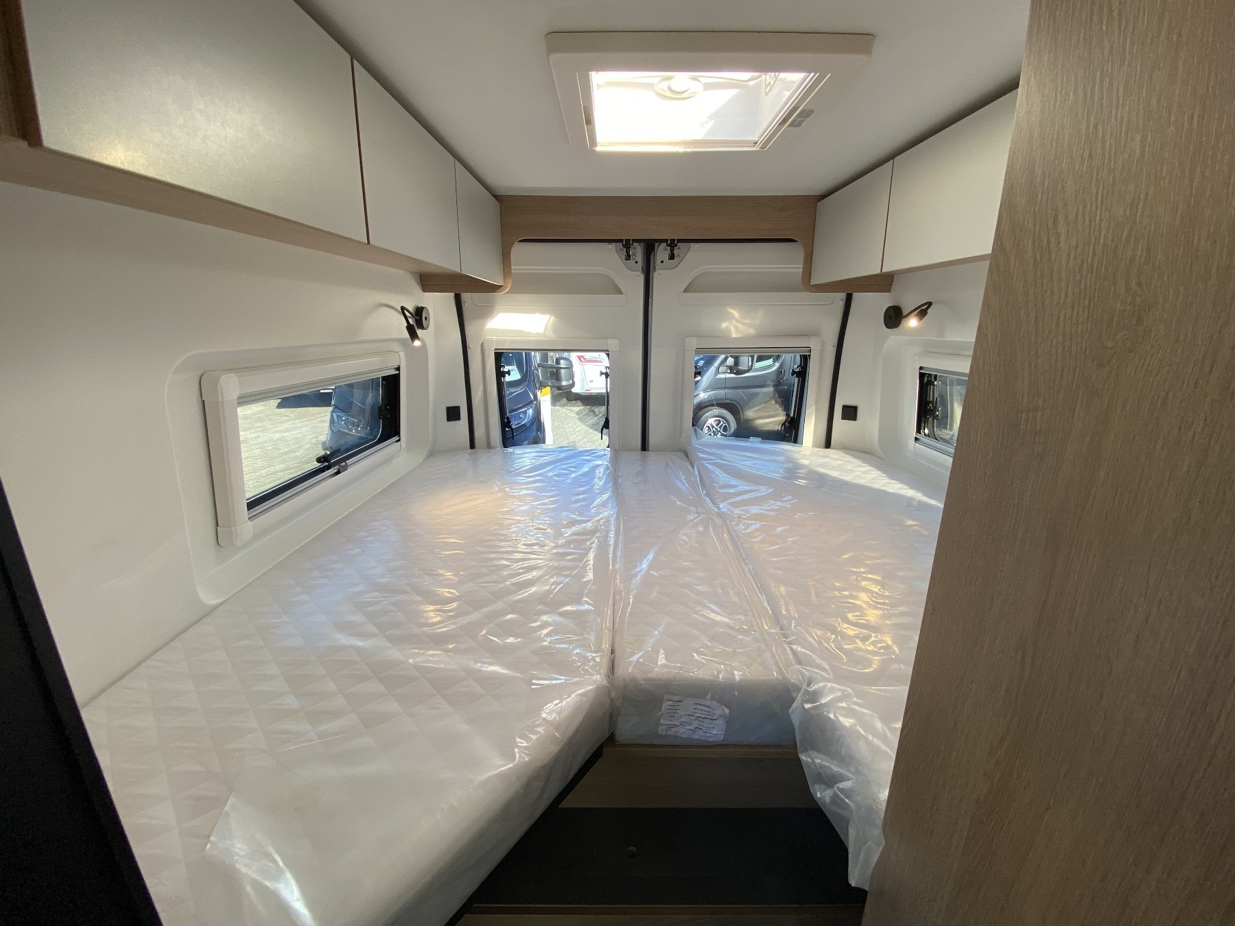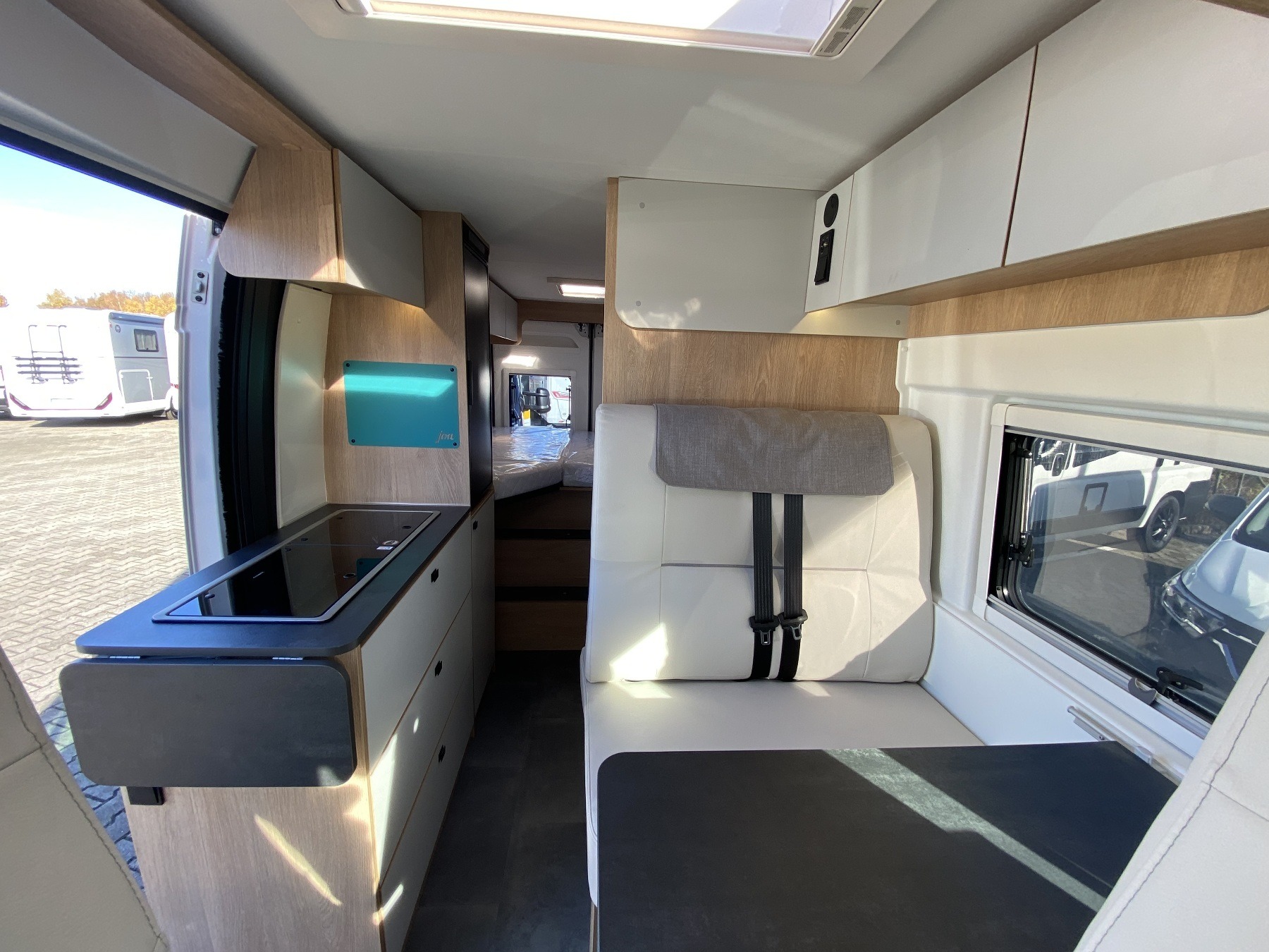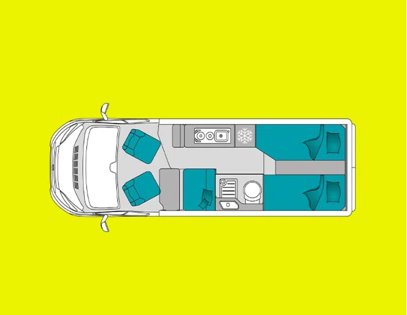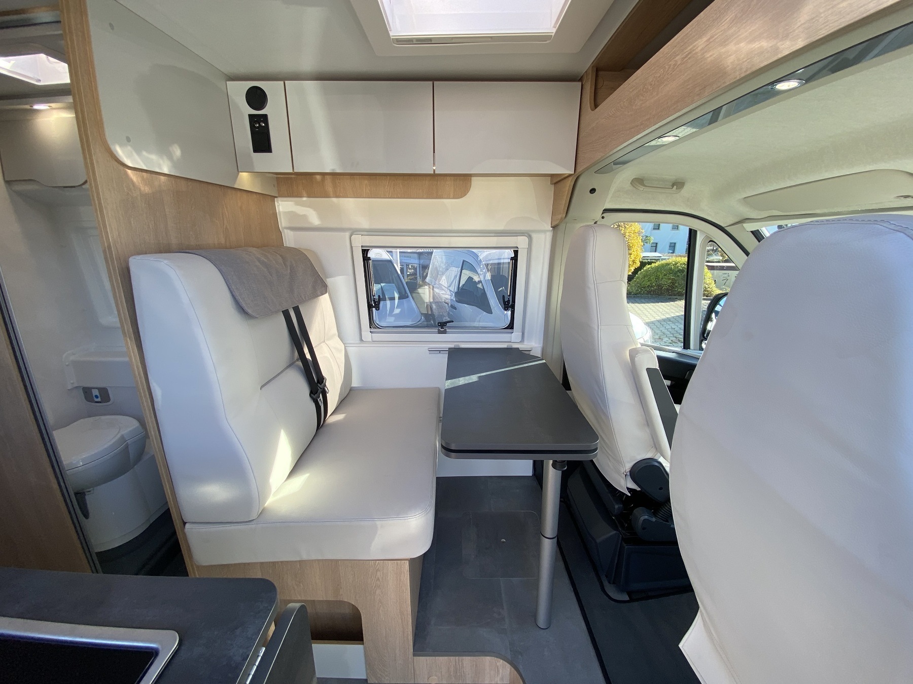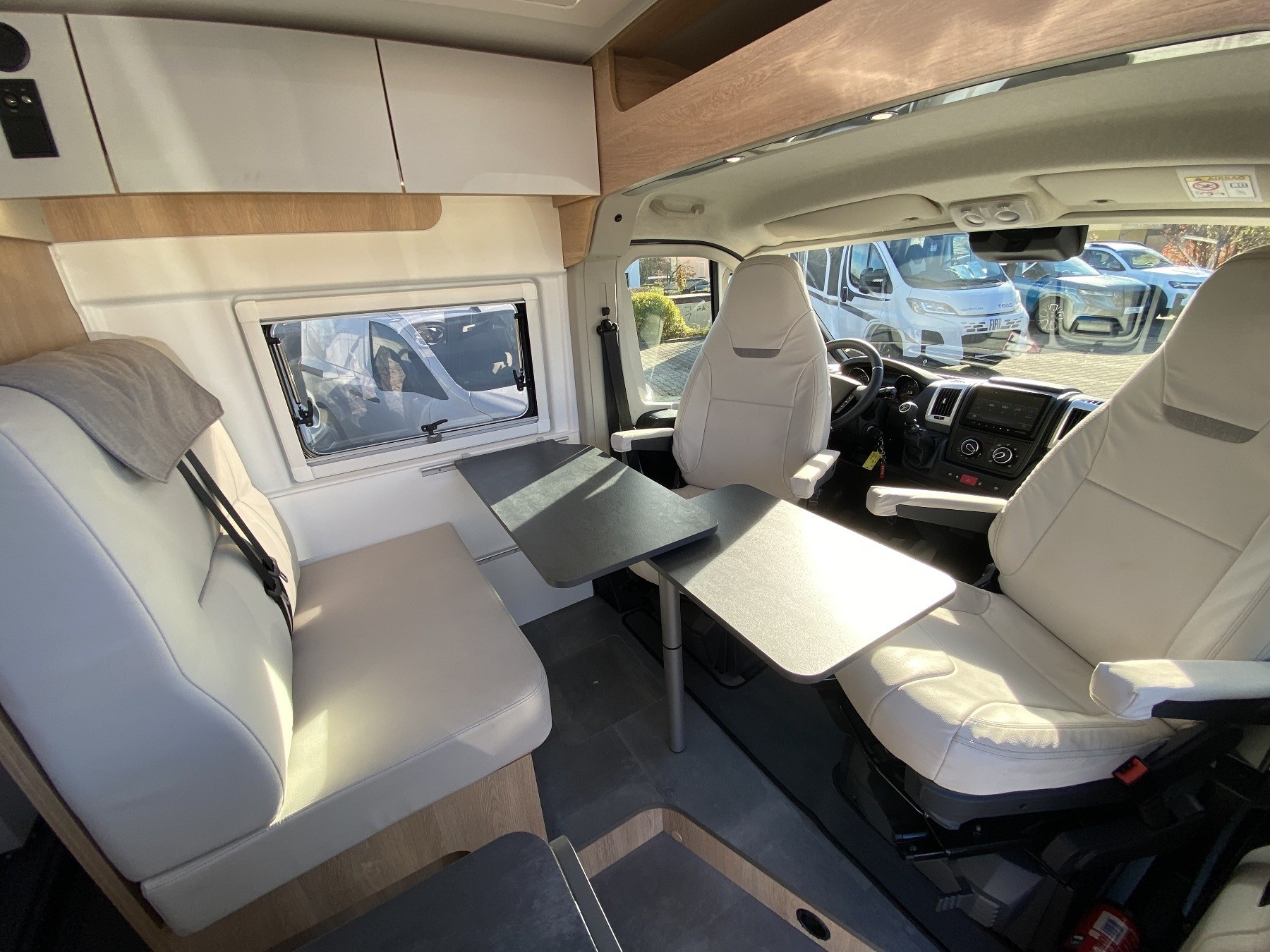 Kunstleder Beige, Alufelgen, Einparkhilfe, Solaranlage 120W, Aufbaubatterie, Rückfahrkamera, Sitzbank Isofifx, Abwassertank isoliert + beheizt, Fenster hinten links und rechts, GPS für Autoradio, Bettenumbau Bereich Sitzgruppe, Crash Sensor, Panorama Schiebedach