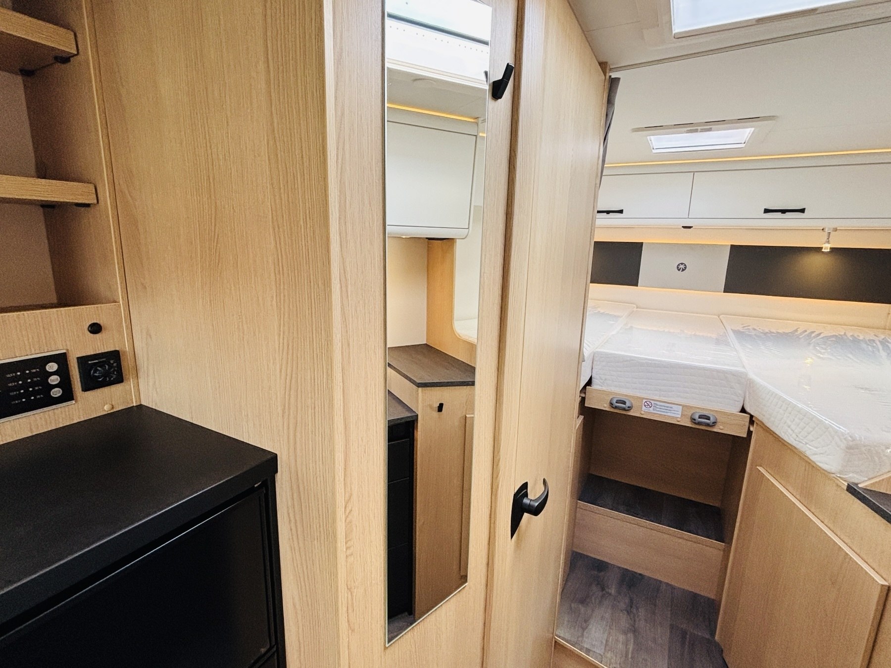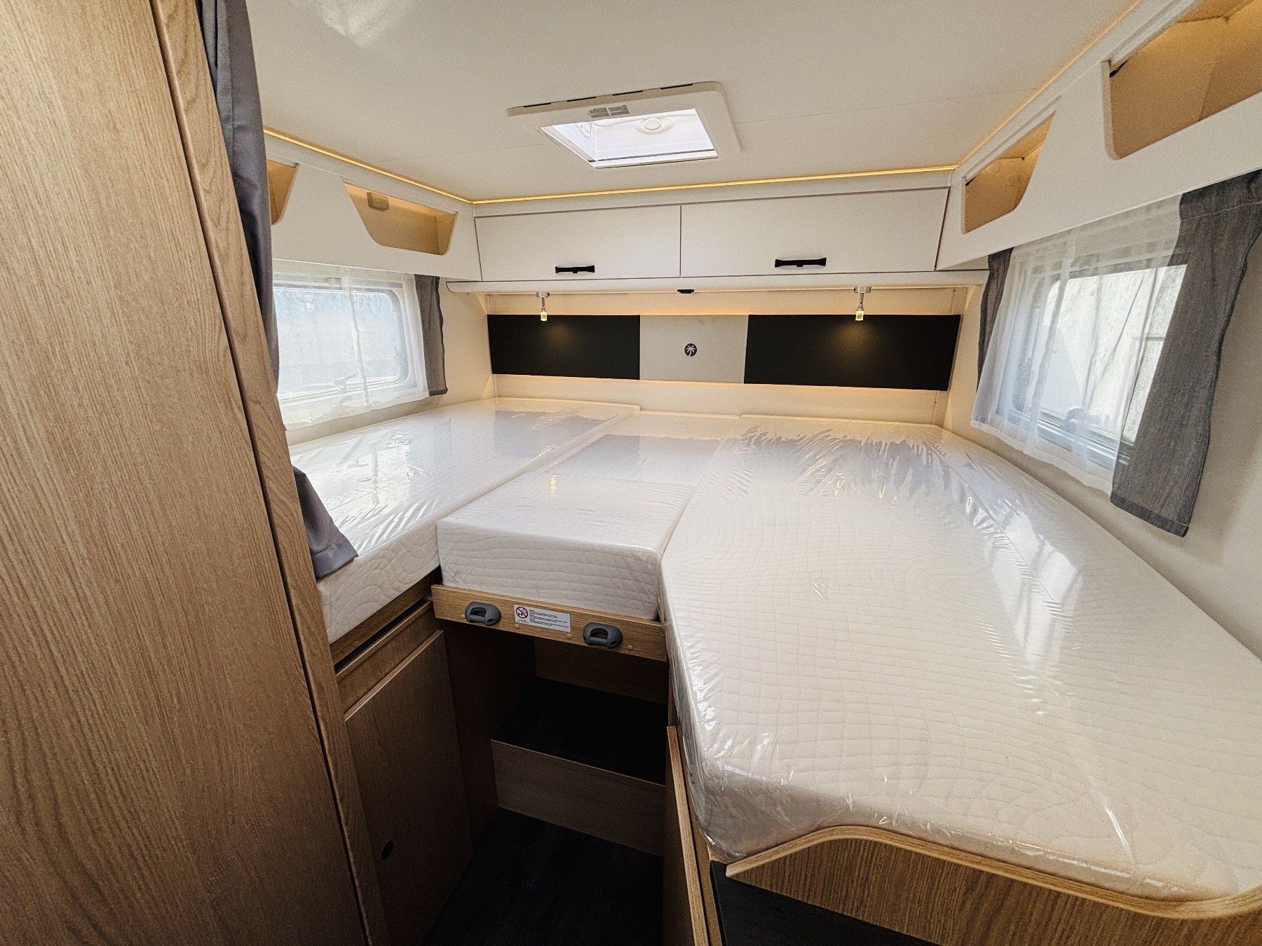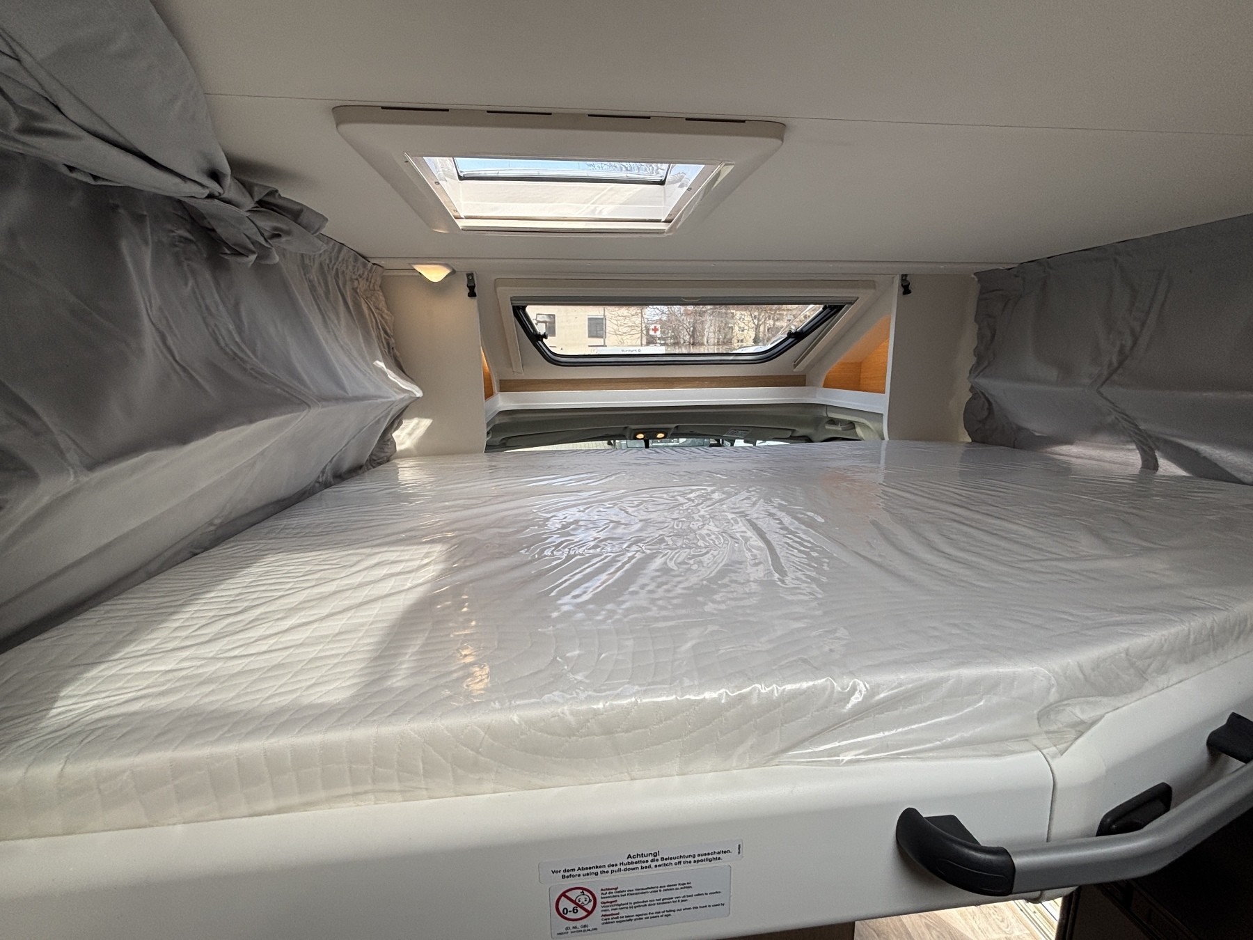 Caramatic SafeDrive Plus (Umschaltanlage+Crashsensor), Hubbett, Holzrost in der Dusche, Faltverdunklung, Kabelvorbereitung für Rückfahrkamera, Kabelvorbereitung Solar, 90l Tank.