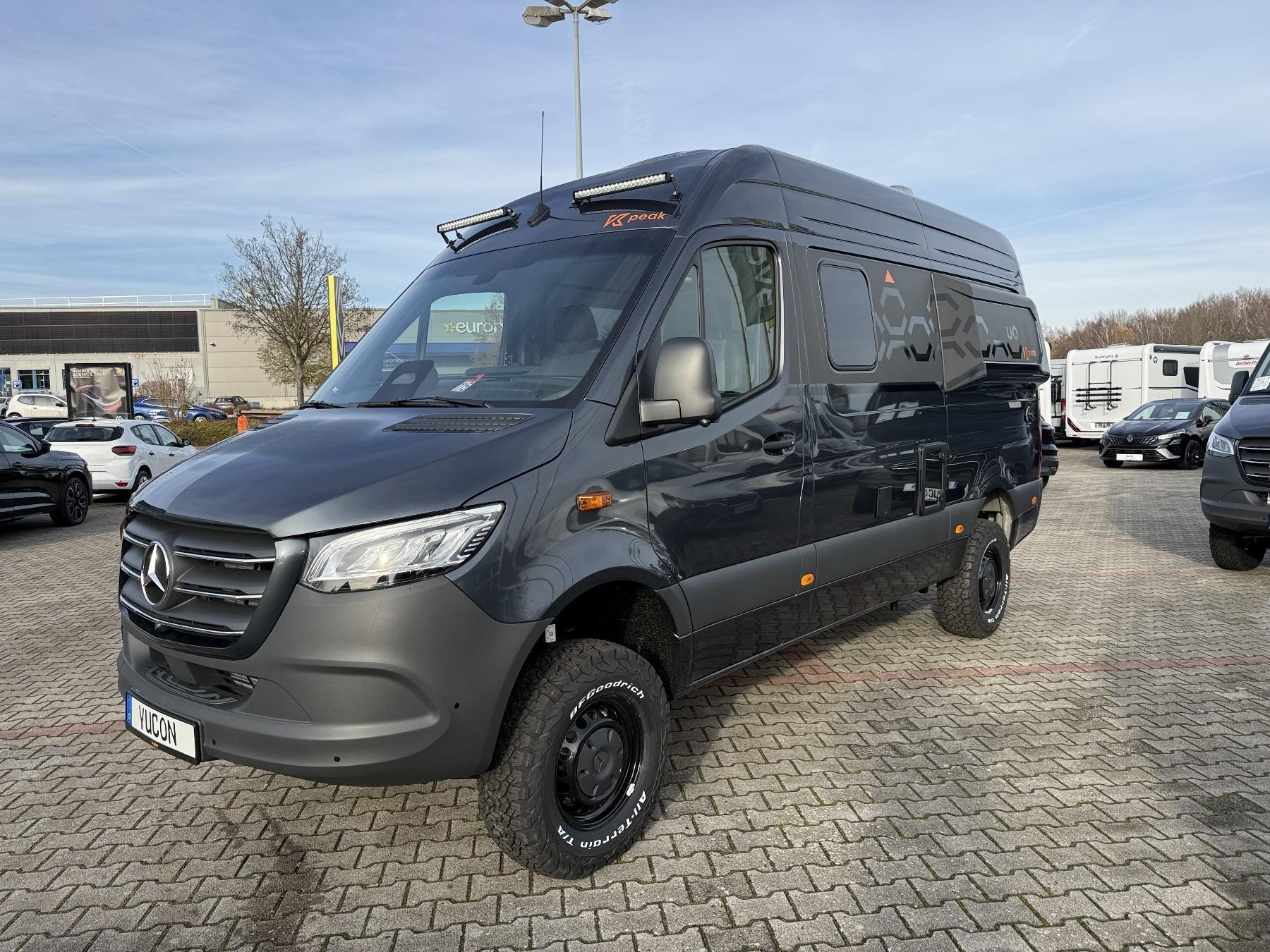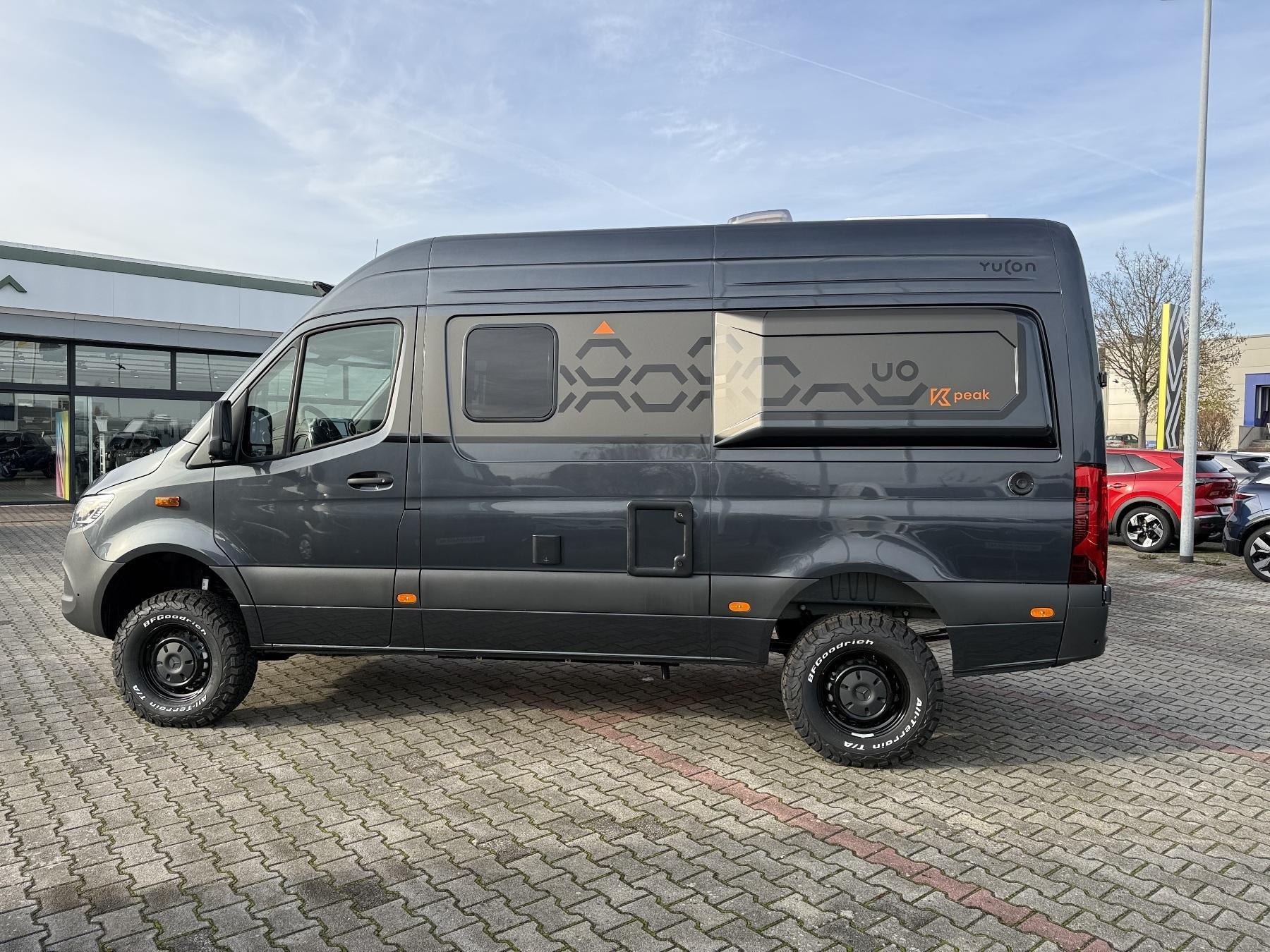 K-Peak Allrad-Edition inklusive: Spezielles Außen- und Innendesign, zusätzliche LED Leuchten an Fahrzeugfront, Batterie Booster, Zusatzladegerät für Starterbatterie, Wäscheleine, Steckdosenpaket, Heizung Abwassertank inklusive elektromagnetischem Ventil zur Entleerung, Vorzeltleuchte,, Fahrerhaus-Teppich, 90 W Solaranlage, Schlafkomfort deluxe, 320 Ah LiFePO Batterie, Dieselheizung, 2000 Watt Wechselrichter, 190 PS, Keyless Start, automatische Klimaanlage THERMOTRONIC, ECOStart-Stopp-Funktion, Abstandstempomat inkl. Multifunktionslenkrad, Automatikgetriebe, Wärmedämmung in Fahrerhaustüren, Geräuschmaßnahmen Mercedes (Motorraumdämmung und Unterbodenverkleidung), elektrische Parkbremse, MBUX 10,25 Zoll, 93 l Dieseltank, elektrische Schließhilfe für Schiebetür, Park-Paket mit 360° Kamera, Kühlergrill in Chromoptik, Klappdeckel für Ablagefach, Grobstollenbereifung 16 Zoll mit Stahlfelgen Original Mercedes (schwarz) (Geschwindkeitsbegrenzung 120 km/h)Allradantrieb, Aufmerksamkeitsassistent, aktiver Spurhalteassistent, Aktiver Abstandsassistent DISTRONIC, Lederlenkrad, Wet Wiper System +Regensensor, Fernlichtassistent, Totwinkelassistent + abklappbare Außenspiegel, LED Scheinwerfer, Aussttiegsbeleuchtung an Schiebetür und Fahrerhaustüren, Anhängersteckdose 13 Polig, Außenfarbe Tenoritgraumetallic"